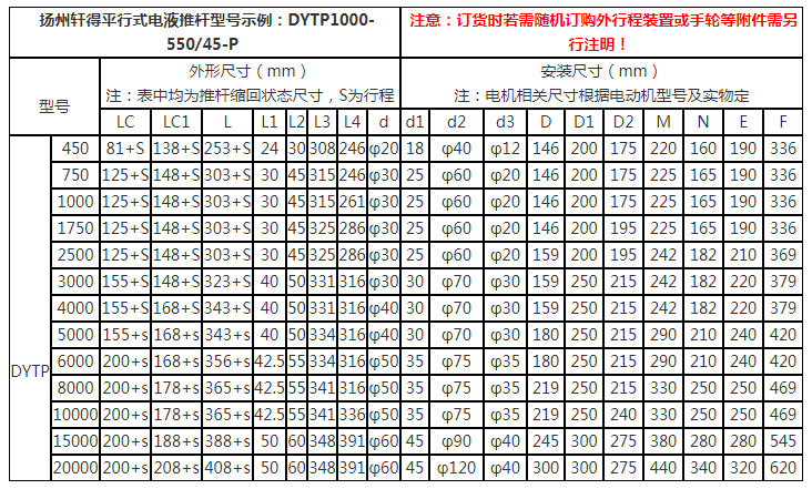 2、表中的電機型號及功率,指該推桿在額定輸出力、額定速度時為最大值的功率,電機功率與推拉力成正比。